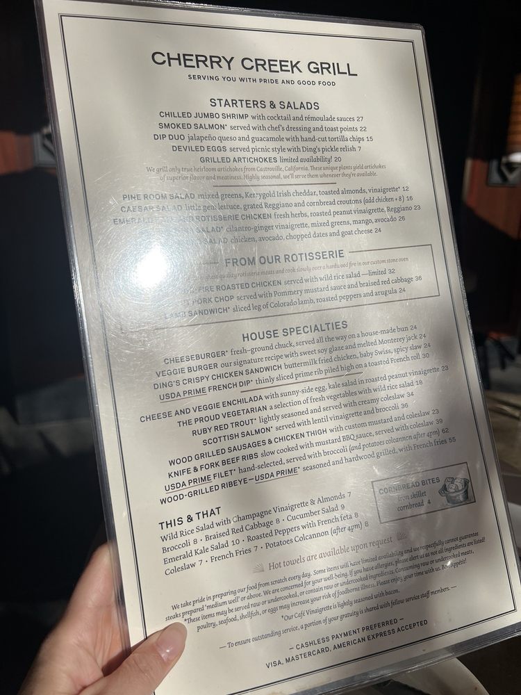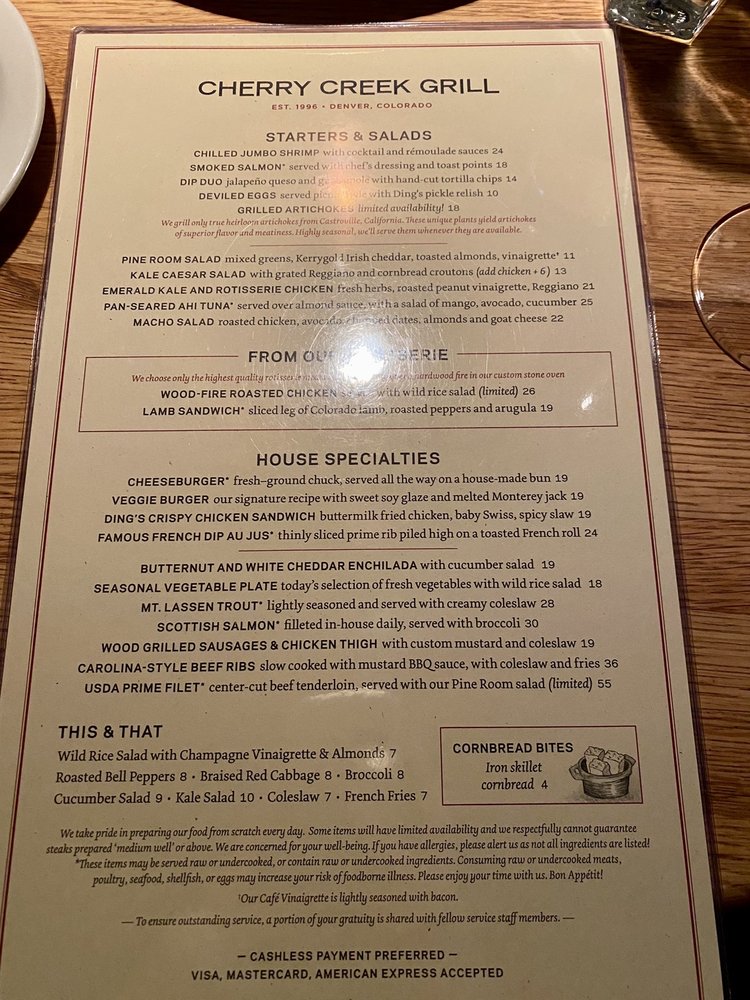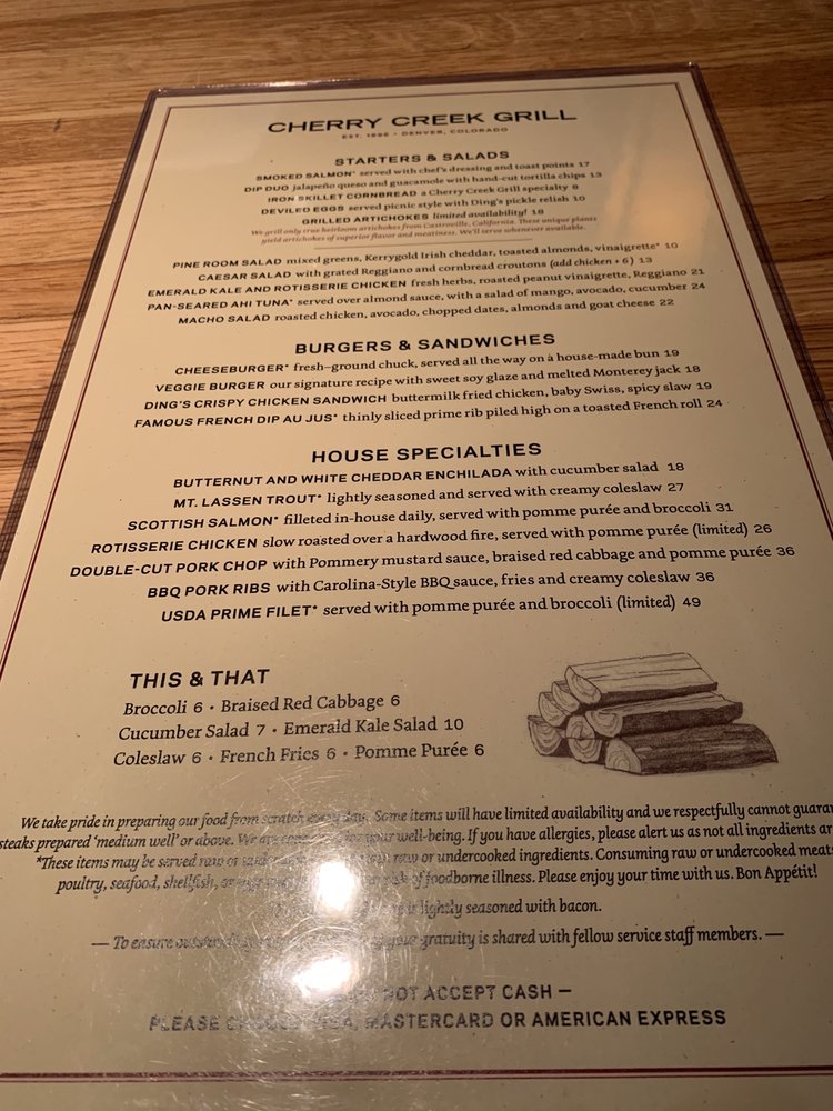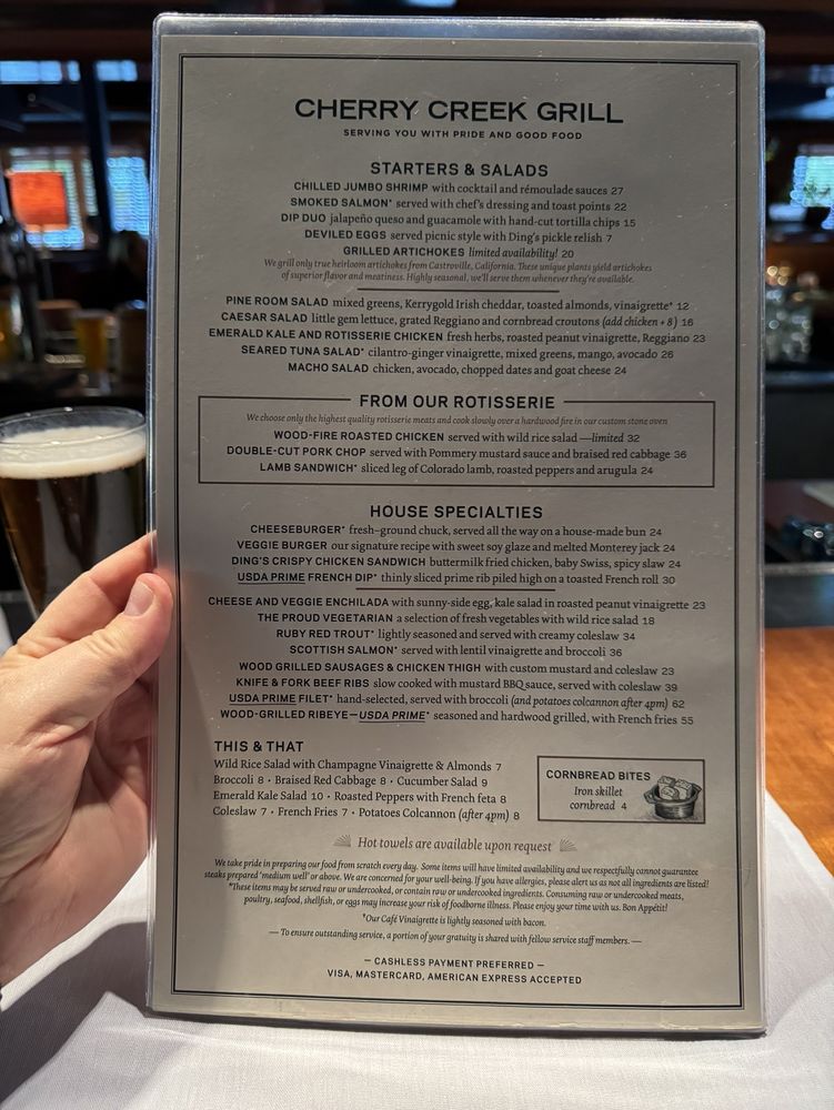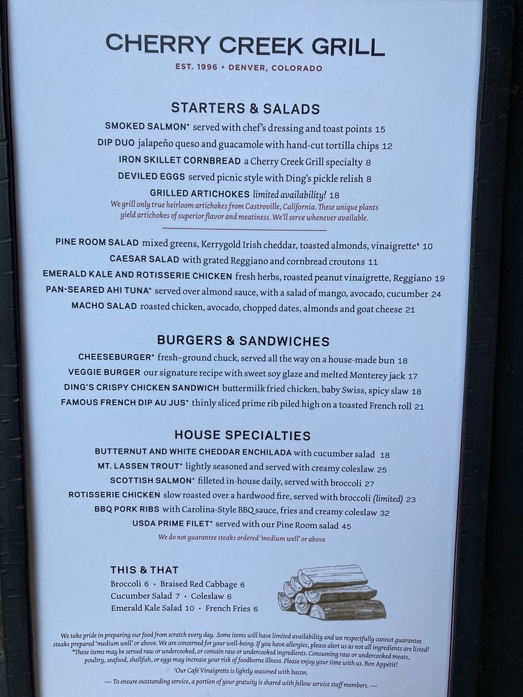 Introducing Cherry Creek Grill, a New American restaurant located in Denver, CO, known for its classy atmosphere and diverse menu. With options for vegans and vegetarians, Cherry Creek Grill offers a range of dishes suitable for various dietary preferences. Customers praise the attentive service and delicious food, with standout items like the artichoke and wood-grilled ribeye receiving high praise. The patio seating provides a perfect setting for enjoying meals during the warmer months. While some dishes like the deviled eggs and sausage may have room for improvement, the overall dining experience and ambiance make Cherry Creek Grill a go-to spot for many. So, if you're looking for a restaurant with a comfortable yet elegant vibe and a menu that caters to different tastes, Cherry Creek Grill is worth a visit.